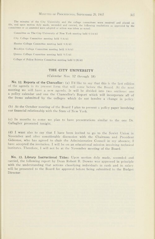 The Downs Report Recommending Faculty Rank for CUNY Librarians After years of being "rather consistently discriminated against in the matter of salaries," librarians at CUNY at last achieved faculty rank through the recommendation of Robert B. Downs, a consultant hired by Chancellor Bowker to examine and report on professional personnel procedures in the libraries. Downs was dean of library administration at the University of Illinois, a former president of the American Library Association, and a fierce champion of intellectual freedom. He argues that the quality of a university depends on the quality of its libraries, and that to meet the challenges posed by its new university status, CUNY would need to recruit and retain well-trained librarians and acknowledge their educational role in the institution. Similar arguments would later take shape in the AAUP's Joint Statement on Faculty Status of College and University Librarians. The "Downs report," as it became known across CUNY Libraries, was entered into the minutes of the Board of Higher Education Proceedings, September 20, 1965, as Calendar No. 13, Library Instructional Titles. At the following meeting, the Board approved revisions to the bylaws that eliminated the ranks of librarian, associate librarian, assistant librarian, assistant to librarian, and junior library assistant; professional librarians were hereafter classified as faculty, with corresponding titles and salaries. -