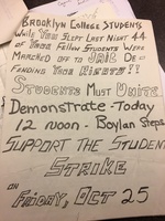October 25, 1974 Student Flyer Announcing Rally in Support of the BC 44 In response to the arrest of 41 Brooklyn College (BC) students and three faculty members, known as the Brooklyn College 44, student activists created and distributed this flyer on October 25, 1974, requesting support of a campus strike. Puerto Rican and African American students took over the Registrar's office at the campus for several days in protest of BC President John Kneller's decision not to hire María Sánchez as the chairperson of the Department of Puerto Rican Studies. This item is part of the Puerto Rican Studies at Brooklyn College (PRSBC) Collection, which covers the largely Puerto Rican-led student movement at Brooklyn College (CUNY) during the late 1960s and early 1970s that fought for the creation of the Puerto Rican Studies Department at the college. The collection includes oral history interviews with pioneering student activists, photographs of participants and their struggles, and other archival materials on the fight to create the Puerto Rican Studies Department drawn from the Archives and Special Collections library at Brooklyn College.