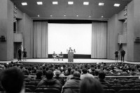 1969 Malcolm X Day and Memorial at Brooklyn College This photo, taken by pioneering student-activist Antonio "Tony" Nieves, member and liaison of the Brooklyn League of Afro-American Collegians (B.L.A.C.) and the Puerto Rican Alliance (P.R.A.) at Brooklyn College (BC). shows Orlando Pile (deated on stage in the middle chair), former president of B.L.A.C at the Malcolm X Day and Memorial at the college in 1969. At the podium is Askia Davis, member of the Black Panther Party and student member of B.L.A.C. This item is part of the Puerto Rican Studies at Brooklyn College (PRSBC) Collection, which covers the largely Puerto Rican-led student movement at Brooklyn College (CUNY) during the late 1960s and early 1970s that fought for the creation of the Puerto Rican Studies Department at the college. The collection includes oral history interviews with pioneering student activists, photographs of participants and their struggles, and other archival materials on the fight to create the Puerto Rican Studies Department drawn from the Archives and Special Collections library at Brooklyn College. -