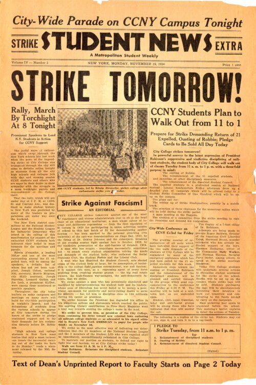 "Strike Tomorrow!" The headline for this edition of Student News announces City College students' strike set for November 20, 1934. The strike was demanded the reinstatement of twenty-one expelled students as well as the removal of City College (CCNY) President Frederick B. Robinson. The twenty-one were expelled following an anti-fascist rally on October 9th.As one article on this front page excerpt notes, the rally began at 11am. It lasted approximately two hours, attracting a crowd upwards of 1,500 students. By event's end, three students were reported to have been arrested during a clash with police and a two-headed effigy of CCNY President Robinson and Italian Prime Minister Benito Mussolini was burned.Student News was published weekly by the National Student League, a Communist-led collective of high school and college students based in New York City. -