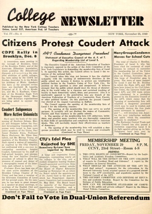 College Newsletter, November 25, 1940 Published by the New York College Teachers Union, this issue of the College Newsletter covers several reactions to the ongoing Rapp-Coudert hearings of the early 1940s.The Rapp-Coudert Committee was a New York State initiative organized in June 1940 to investigate and identify "subversive activities" and persons in New York City's public schools and colleges. As two of the articles from this extract attest, several teachers' unions were targeted in the initial stages of the investigation as their membership rolls comprised many union activists. City College, in particular, became a target of the commitee with dozens of faculty and staff called to public and private hearings. -