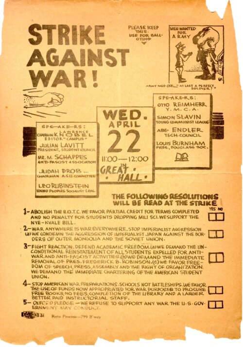 "Strike Against War!" Flier This flier advertises an April 22, 1936 anti-war demonstration in the Great Hall at the City College of New York (CCNY). The event, attended by 3,500 students, featured addresses from student and faculty leaders as well as a vote that reaffirmed the students' fight against both the ROTC on campus and CCNY President Frederick Robinson. They further denounced perceived American war preparations and Japanese imperial aggression, and announced their refusal "to support the government of the United States in any war it may undertake." Like several other rallies from the previous year, this demonstration was part of a larger coordinated nationwide effort of left-wing and liberal students that day led by the American Student Union, around 500,000 participated in all. At CCNY, day students left class at 11am to participate in the strike while evening students held a similar rally later that night. Perhaps the most immediate consequence of the protest was the firing of Morris Schappes, a professor in the English Department who had spoken at the rally on behalf of the Anti-fascist Association. His firing, announced the day of the rally though attributed to other causes, would spark an outcry amongst many in the CCNY community. As a result of their efforts, he retained his job though it was not long before Schappes' political leanings would lead to his dismissal and imprisonment in 1941. -
