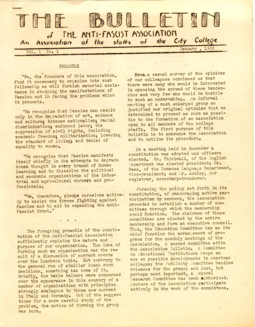 The Bulletin of the Anti-Fascist Association, January 1935 Founded by City College staff in early 1935, the Anti-Fascist Association was a collective of likeminded left-wing and liberal faculty who perceived and fought against a rising threat of fascism abroad and militarism at home. The group held monthly meetings and published their newsletters monthly as well. The document is the front page of the group's inaugural bulletin. The Anti-Fascist Association counted approximately 200 members in its ranks, including senior faculty, with representatives from the organization often speaking at student-organized anti-war rallies. In 1936, one such representative, English instructor Morris Schappes, would be fired just hours after addressing a crowd of student protestors. -