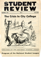 "The Crisis in City College" On this cover of the December 1933 edition of the National Student League's Student Review, CCNY President Robinson is depicted in full academic regalia as a cat, following in step behind a German military officer. Robinson's tail, meanwhile, is wagged by Tammany Hall, New York’s corrupt Democratic political machine. During his time at City College, Robinson drew extraordinary criticism from the left, particularly because of his repeated attempts to stifle free expression on campus. In May 1933, Robinson issued suspensions to a number of students, clubs, and campus publications following an anti-war/anti-ROTC rally in which he was alleged to have struck multiple students with his umbrella prior to his calling for police presence on campus. -