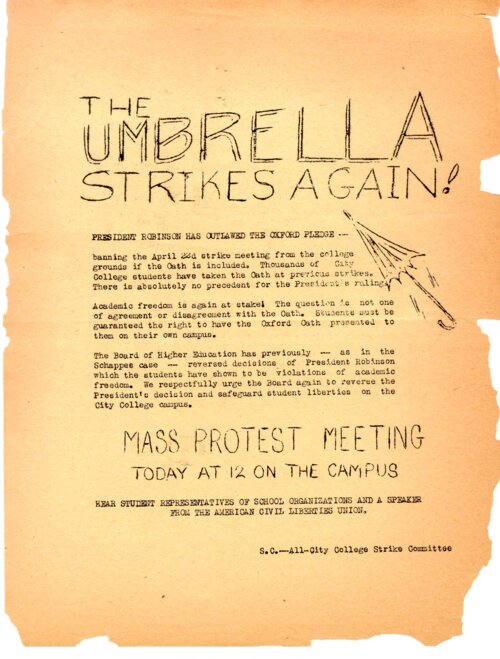 "Umbrella Strikes Again!" Flier This flier promotes an April 14, 1937 student protest against City College President Frederick B. Robinson's decision to ban the "Oxford Pledge" from the CCNY campus. The pledge, an American adaptation of the British original, comprised an oath in which students stated: "I refuse to support the Government of the United States in any war it may conduct." The oath had been a part of protest gatherings in the prior years, though with the new decision, the administration would refuse use of campus facilities to student organizations that employed the pledge. The "umbrella" mentioned on the flier was used in reference to CCNY President Robinson who, in May 1933, allegedly struck multiple students with his umbrella at an anti-war rally on campus. Students adopted the umbrella as a symbol for Robinson for the remainder of his presidency. -