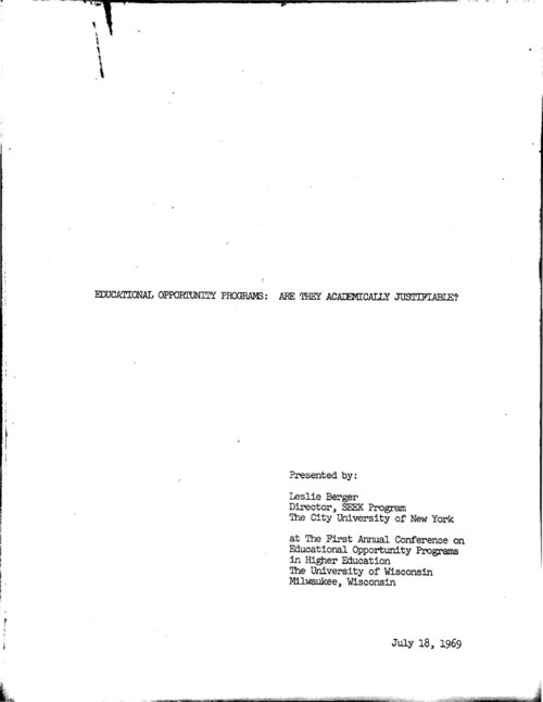 Educational Opportunity Programs: Are They Academically Justifiable? In this 22-page, July 1969 Milwaukee speech to the first annual conference on educational opportunity programs in higher education, Leslie Berger--director of CUNY's SEEK program--describes the birth and rapid growth of SEEK from 1965 to 1969; challenges the validity of admissions criteria as accurate measures of student potential; and explains SEEK’s open admissions, psychological counseling, creative teaching, stretch courses and financial aid. He also responds to calls for black administrators and teachers within EOP programs as well as more relevant curricula across colleges. Short for "Search for Education, Elevation, and Knowledge," SEEK was established as a CUNY-wide program to assist disadvantaged students who might have otherwise lacked the opportunity to study at a four-year college. -