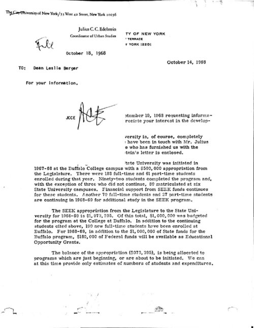 Letter from Samuel B. Gould to John H. Hughes In this letter to New York State Senator Hughes, SUNY Chancellor Gould describes the new SUNY SEEK Program. Gould had shown copies to CUNY’s Chancellor Bowker and Julius Edelstein, CUNY’s “Coordinator of Urban Studies,” who had forwarded the letter to Dean Leslie Berger. Gould describes the launch of SUNY SEEK at Buffalo College in 1967-68 with $500,000 in state funding and the program’s rapid expansion in various forms across SUNY in 1968-69 with $2 million in state funding. -