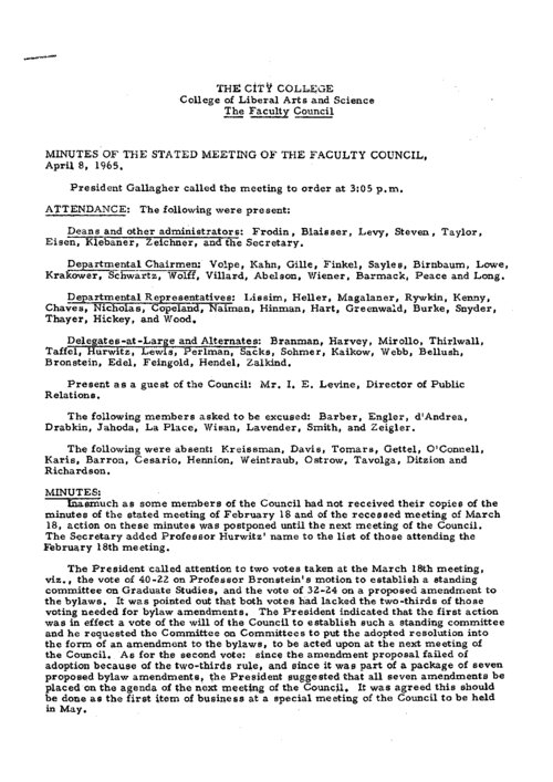 Minutes from 4/8/1965 CCNY Faculty Council Meeting In these notes from a liberal arts and sciences faculty council meeting at City College, CCNY President Gallagher describes a tentative plan to admit 100 “disadvantaged” students into an experimental program in fall 1965. After discussion, the faculty authorizes Chancellor Bowker to appoint a joint committee with the school of education to a plan and launch a CUNY-wide expansion of CCNY's experimental program that, in 1966, would become the SEEK program. -