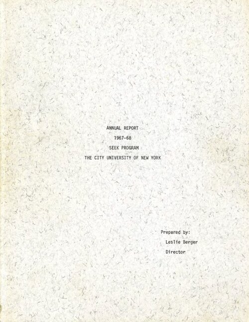 1967 - 1968 Annual Report of the SEEK Program This is a CUNY-wide report for the SEEK program during the 1967-68 academic year. Included in the document is a cover letter from SEEK director Leslie Berger to CUNY Chancellor Albert Bowker, a table of contents, a list of SEEK administrators, and then 91 pages with 20 sections, including reports about SEEK programs at Brooklyn, City, Hunter-Bronx (Lehman), Queens, and York Colleges and The University Center. Short for "Search for Education, Elevation, and Knowledge," SEEK was established in 1965-1966 as a CUNY-wide program to assist disadvantaged students who might otherwise lack the opportunity to study at a four-year college. -