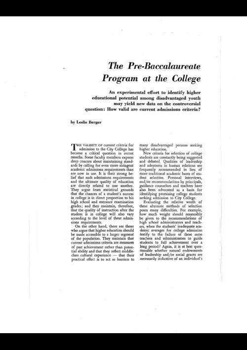 The Pre Baccalaureate Program at the College In this December 1966 City College Alumnus article, Leslie Berger publicly describes and advocates for the City College SEEK model and challenges all traditional college admissions criteria as incompetent measures of student potential. Short for "Search for Education, Elevation, and Knowledge," SEEK was established in 1966 as a CUNY-wide program to assist disadvantaged students who might otherwise lack the opportunity to study at a four-year college. Berger was the program's founding director at CUNY. -