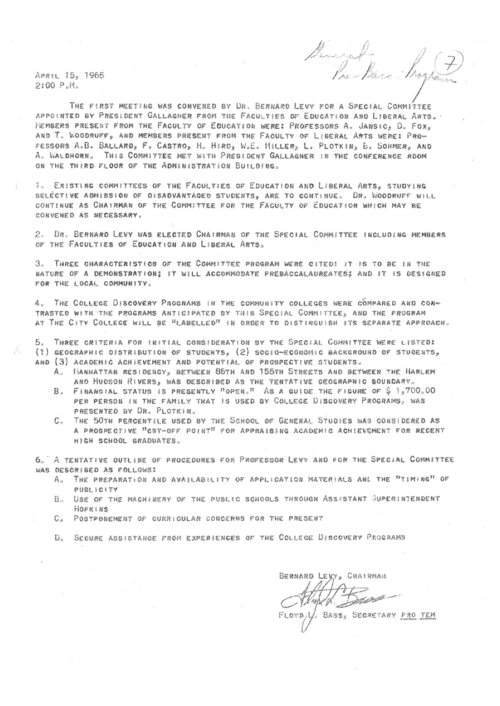 Minutes of April 1965 CCNY "Special Committee" One week after CCNY President Buell Gallagher obtained faculty approval for its creation, he sat in on this “Special Committee” meeting chaired by Bernard Levy to begin to plan a new racial and social justice admissions and support program that would draw applicants from the communities surrounding City College. In practice, the actual planning of the program quickly fell to three professors: Allen Ballard, Bernard Sohmer and Leslie Berger. Ballard and Sohmer are listed in attendance at this meeting. The efforts of the group ultimately contributed to the creation of the CUNY-wide SEEK program in 1966 following a CCNY-specific program the prior year. -