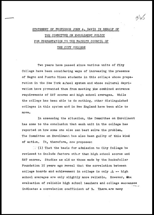 Statement of Professor John A. Davis In this 1965 statement Professor John A. Davis demands that his colleagues at City College take action to increase minority representation at the school. He writes that two years had “passed since various units of City College have been considering ways of increasing the presence of Negro and Puerto Rican students in this college.” Yet, he complains, “the college has been able to do nothing” while other colleges have acted. As a result, Davis proposes: 1) a desegregation program to immediately admit fifty students based on teacher recommendations as well as GPA/SAT scores, 2) beginning summer programs for “culturally deprived” high school juniors and seniors and then admitting them to City College with the help of “guidance and tutorial centers,” and 3) helping to improve the public schools through City’s School of Education. Davis grew up in Washington D.C. where, in the 1930s, he organized effective black boycotts of racist white businesses, setting off a legal fight that ended in a 1938 Supreme Court victory upholding the picketing rights of civil rights protesters, (New Negro Alliance v. Sanitary Grocery, Co., Inc.) Davis joined City College as a political science professor in 1953-- the same year he assisted the NAACP team in the Brown v. Board of Education case. -