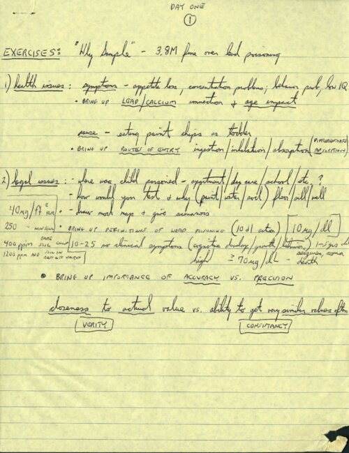 "Why Sample?" and other classroom exercises These handwritten instructor's notes from a 1999 training session were prepared for a one-day course taught by Hunter College's Center for Occupational and Environmental Health (COEH). The notes outline various classroom exercises designed to engage students collaboratively, often encouraging them to think about the health and legal implications of various occupational health issues, including lead poisoning and air pollution. In addition to the notes is an annotated newspaper article handed out to the class. Its markup reflects the instructor's intended instruction and interpretation of the article. Officially founded in 1990, the COEH spent decades dedicating itself to promoting community and workplace health throughout the New York area. It offered courses on topics ranging from asthma to ergonomics for unions, neighborhood groups, public employees, and others. -
