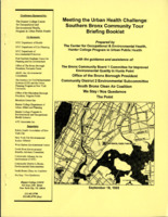 Meeting the Urban Health Challenge: Southern Bronx Community Tour Briefing Booklet Prepared by Hunter College's Center for Occupational and Environmental Health (COEH) in 1998, this booklet was created to introduce residents of two community districts in the Southern Bronx to important issues of public health in their neighborhoods. In addition to selected health facts (e.g. asthma, lead poisoning prevalence), the book offers a brief overview of the area's physical environment. Though the Center frequently worked with labor unions, public employees, and college students, its community outreach efforts--particularly in underserved areas such as the South Bronx--marked its most direct work with the general public in the New York City area. Officially founded in 1990, the COEH spent decades dedicating itself to promoting community and workplace health throughout the New York area. It offered courses on topics ranging from asthma to ergonomics for unions, neighborhood groups, public employees, and others. -