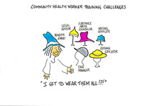 Community Health Worker Training Artwork Created in 2000 by Ted Outwater, then associate director and environmental specialist for Hunter College's Center for Occupational and Environmental Health (COEH), these illustrations reflect some of the challenges that faced community health workers. One of COEH's major initiatives, the Community Health Worker Training Program recruited local residents from New York City neighborhoods for an extensive 350-hour curriculum that educated participants on the topic of asthma, its management, assessment, and remediation. Following their training, these health workers where entrusted with providing outreach to their communities, serving as a "vital link between health care providers, community organizations, and the communities they serve." In April 2000, the program commenced with an initial class of 15 health workers from a variety of community groups. Officially founded in 1990, the COEH spent decades dedicating itself to promoting community and workplace health throughout the New York area. It did so by offering courses on topics ranging from asthma to ergonomics for unions, neighborhood groups, public employees, and more. -
