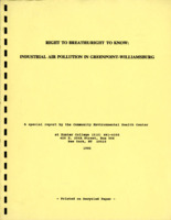 "Right to Breathe/Right to Know: Industrial Air Pollution in Greenpoint-Williamsburg" This executive summary is an excerpt from a larger report on industrial air pollution in Greenpoint-Williamsburg produced by Hunter College's Center for Occupational and Environmental Health (COEH) in 1992. In addition to a brief analysis of the Brooklyn neighborhood's air quality, the report offers suggestions for clean-up. Officially founded in 1990, the COEH spent decades dedicating itself to promoting community and workplace health throughout the New York area. It offered courses on topics ranging from asthma to ergonomics for unions, neighborhood groups, public employees, and others. -