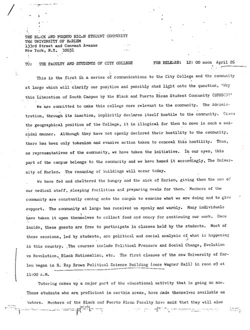 Press Release from Black and Puerto Rican Student Community This press release, written by protesting black and Puerto Rican students at City College on April 26, 1969, offers insight into the group's motivation behind their protests in the preceding months. Arguing for CCNY to better serve its surrounding Harlem community, the statement describes student efforts to create a community-based educational institution that they named, the "University of Harlem." The students' calls for CCNY's greater community involvement lay at the heart of their published Five Demands. Those demands, which called for among other things, greater diversity and representation on campus, ultimately affected the early implementation of the policy of Open Admissions. -