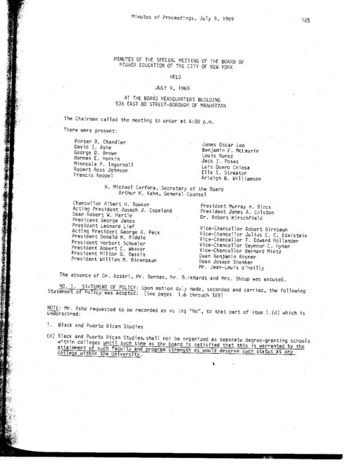 Statement of Policy by the Board of Higher Education This "statement of policy", attached to the minutes from a meeting of the Board of Higher Education on July 9, 1969, reflects the culmination of negotiations between college officials and protesting City College students. The students, most of whom were black and Puerto Rican, had previously enumerated a list of five demands pertaining to campus diversity and representation. The Board's statement offers a response and plan of action intended to address each demand. Most notably, it announces college officials' intention to expedite plans for Open Admissions. It would begin in fall 1970, instead of the previously announced start date of 1975. -