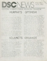 Doctoral Students Council News: Murphy's Optimism This Doctoral Students’ Council (DSC) newsletter, published in 1982, covered adjunct news that ranged from notes on a meeting the DSC steering committee had with Chancellor Murphy to a satirical piece entitled “How not to be an Adjunct”. The article "Adjuncts Organize" argued that only an independent adjunct faculty union could improve working conditions for adjuncts.The Doctoral Students’ Council, a student organization at the CUNY Graduate Center that actively addressed Adjunct issues, would later launch the Adjunct Project. -