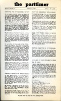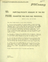 The Parttimer: Committee for Part-Time Instructional Staff This 1974 issue of The Parttimer, a Professional Staff Congress (PSC) newsletter, announced the Delegate Assembly's official approval of a newly formed Committee for Part-time Instructional Staff. The Committee for P/T personnel was an organization representing the interests of union and non-union part-time staff. Those elected included David Allen, Chair, and Bill Leicht, Vice President for Part-Time Personnel. In addition, the issue featured a letter from a physics professor at Lehman College accusing the PSC of "[selling] the adjuncts down the river" in contract negotiations.The Committee for Part-time Instructional Staff was a standing committee of the PSC Delegate Assembly responsible for addressing problems facing Part-time Instructional staff. -