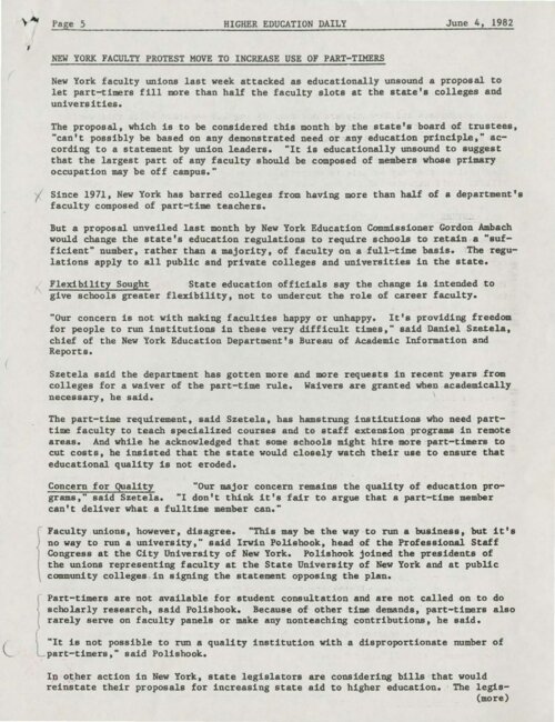 NY Faculty Protest Move to Increase Use of Part-Timers Published on June 4, 1982 in he Higher Education Daily, this article, entitled "NY Faculty Protest Move to Increase Use of Part-Timers," reported that NYS faculty unions attacked NYS Education Commissioner Gordon Ambach’s proposal to let part-timers fill more than half the faculty slots at both public and private universities. State education officials claimed that the intention was to give colleges more flexibility, while faculty unions were concerned that the proposal was “educationally unsound.” -