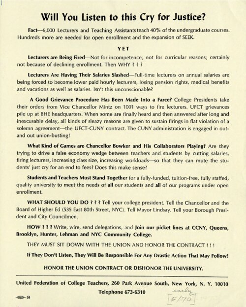 "Will You Listen to this Cry for Justice?" This flyer, produced and circulated in 1970 by the United Federation of College Teachers (UFCT), called for students and teachers to stand together and demand that CUNY honor the contract. It stated that despite 6,000 lecturers and teaching assistants (adjuncts) teaching 40 percent of CUNY's undergraduate courses and many more needed to accommodate CUNY's recently implemented Open Admissions program and the Search for Education, Elevation, and Knowledge (SEEK) program, lecturers were being fired and their hours and salaries cut.During the 1960s, the United Federation of College Teachers (UFCT), and the Legislative Conference (LC) were the two main organizations that advocated for the concerns of CUNY faculty. The UFCT represented part-time faculty and lecturers while the LC was the union of tenured professors. The groups merged in 1972 to form the Professional Staff Congress, which represents CUNY faculty today. -
