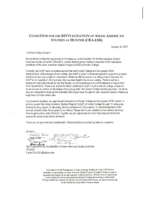 In this letter dated October 30, 2007, students announce the formation of the Coalition for the Revitalization of Asian American Studies at Hunter (CRAASH). Consisting of eight students, CRAASH organized in immediate response to the inadequate conditions facing the Hunter AASP, including a $0 budget, lack of a permanent department head and full-time faculty, and stagnant course offerings. CRAASH later evolved into a formal student club, though advocating for the AASP has remained part of its central mission. The Hunter College Asian American Studies Program (AASP) was established in 1993. As the only academic program in Asian American studies in the CUNY system, the AASP offers a minor in Asian American Studies and other resources and programming. The AASP supports scholars, artists, and activists advancing scholarship in the fields of Asian American studies and critical ethnic studies and serves as a resource for New York City's Asian American communities. In 2006, the program was at risk of being cut due to a lack of funding. Students formed the Coalition for the Revitalization of Asian American Studies at Hunter (CRAASH) and saved the program within a year. CRAASH is now a student-run club that continues to advocate for the AASP.
