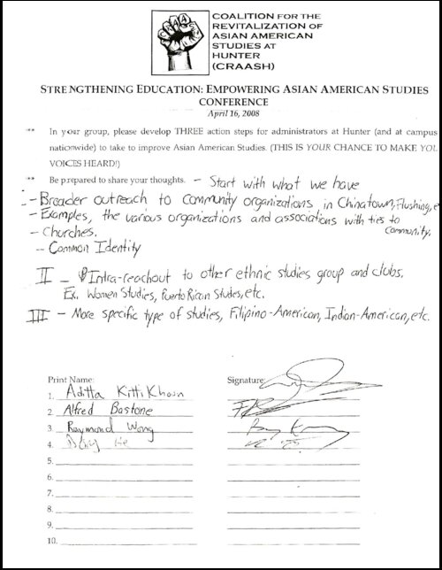 Eight students came together to form CRAASH when Hunter student Olivia Lin discovered that the program could not offer her a minor because it had no director to formally do so. In response to the freeze on the AAS minor as well as the program’s lack of full-time faculty, budget, space, course offerings, and other resources, CRAASH began organizing students in the Fall of 2007 to advocate for increased funding, the allocation of full-time professors for the program, and the expansion of course offerings. Many of CRAASH’s strategies are documented in this collection—including articles that resulted from its media outreach strategy, the 2008 “Strengthening Education: Empowering Asian American Studies” conference they organized, and their petition which collected over 1,000 signatures.