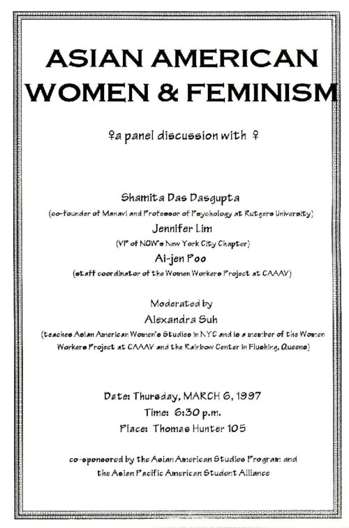 This program is for a panel event titled "Asian American Women and Feminism," which took place on March 6, 1997. The event was sponsored by the Hunter Asian American Studies Program and the Asian Pacific American Student Association. The panel featured Shamita Das Dasgupta, Jennifer Lim, Ai-Jen Poo, and Alexandra Suh. The panelists discussed the existence, lineages, and directions of a burgeoning Asian American women's movement and Asian American feminism, speaking from their experiences working with CAAAV's Women Workers Project, Manavi, and the National Organization of Women. Poo, went on to win a MacArthur Fellowship in 2014 for her work as director of the National Domestic Workers Alliance and her long history of community organizing, which began with organizing domestic workers at CAAAV in 1996. The Hunter College Asian American Studies Program (AASP) was established in 1993. As the only academic program in Asian American studies in the CUNY system, the AASP offers a minor in Asian American Studies and other resources and programming. The AASP supports scholars, artists, and activists advancing scholarship in the fields of Asian American studies and critical ethnic studies and serves as a resource for New York City's Asian American communities. In 2006, the program was at risk of being cut due to a lack of funding. Students formed the Coalition for the Revitalization of Asian American Studies at Hunter (CRAASH) and saved the program within a year. CRAASH is now a student-run club that continues to advocate for the AASP.