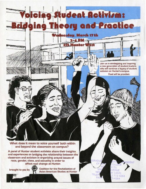 This poster advertises a panel titled "Voicing Student Activism: Bridging Theory and Practice," which the Coalition for the Revitalization of Asian American Studies at Hunter hosted on March 17, 2010, at Hunter College. The panel brought together Hunter student activists speaking about their experiences organizing on campus around issues of race, gender, class, and sexuality to strategize and inspire "a new generation of student leaders who will continue a legacy of student activism on Hunter's campus." The poster's illustration depicts four individuals, two with fists raised, in front of Hunter's sky bridge. The Hunter College Asian American Studies Program (AASP) was established in 1993. As the only academic program in Asian American studies in the CUNY system, the AASP offers a minor in Asian American Studies and other resources and programming. The AASP supports scholars, artists, and activists advancing scholarship in the fields of Asian American studies and critical ethnic studies and serves as a resource for New York City's Asian American communities. In 2006, the program was at risk of being cut due to a lack of funding. Students formed the Coalition for the Revitalization of Asian American Studies at Hunter (CRAASH) and saved the program within a year. CRAASH is now a student-run club that continues to advocate for the AASP.