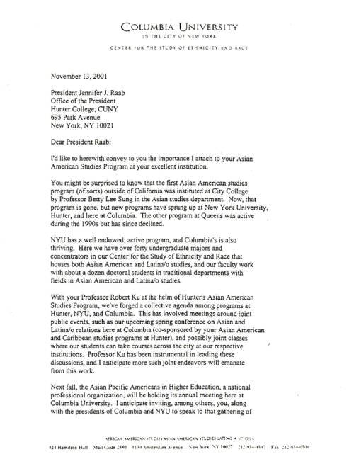 This is a letter written by Dr. Gary Okihiro, dated November 13, 2001, and addressed to Hunter College President Jennifer J. Raab. In the letter, Dr. Okihiro urges Raab to invest in Asian American studies faculty, including a stable director, "to continue to build on Hunter's pioneering position in Asian American studies." Dr. Gary Okihiro was the director of the Asian American Studies Program at Cornell University from 1992-1999, after which he was recruited to Columbia University to be the founding director of their Asian American Studies Program as well the founding director of the Center for the Study of Ethnicity and Race. He and Dr. Betty Lee Sung (City College/CUNY) have both received Lifetime Achievement Awards from the Association for Asian American Studies. His letter of support indicates the important role of the Hunter Asian American Studies Program in the vitality of the discipline at large. The Hunter College Asian American Studies Program (AASP) was established in 1993. As the only academic program in Asian American studies in the CUNY system, the AASP offers a minor in Asian American Studies and other resources and programming. The AASP supports scholars, artists, and activists advancing scholarship in the fields of Asian American studies and critical ethnic studies and serves as a resource for New York City's Asian American communities. In 2006, the program was at risk of being cut due to lack of funding. Students formed the Coalition for the Revitalization of Asian American Studies at Hunter (CRAASH) and saved the program within a year. CRAASH is now a student-run club that continues to advocate for the AASP.