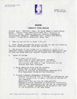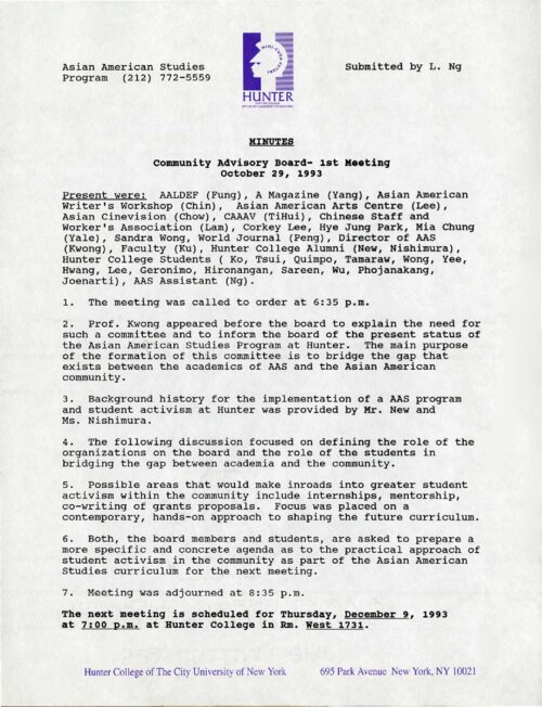 These minutes document the Hunter Asian American Studies Program (AASP)'s first Community Advisory Board meeting which took place on October 29th, 1993. In attendance included representatives from prominent community organizations including The Asian American Legal Defense and Education Fund (AALDEF), A Magazine, Asian American Writers' Workshop, Asian American Arts Centre, Cinevision, Committee Against Anti-Asian Violence (CAAAV), and Chinese Staff and Workers' Association. During the meeting, students Woei-Ming New and Kelly Nishimura shared background history on the implementation of the AASP and student activism. There was also a discussion about how Hunter students could engage in activism in the broader New York City Asian American community. The purpose of the Community Advisory Board was to advise the AASP on how to best serve the needs and interests of the Asian American community in New York City as well as to bridge the gap between scholars of Asian American studies and the community. The Hunter College Asian American Studies Program (AASP) was established in 1993. As the only academic program in Asian American studies in the CUNY system, the AASP offers a minor in Asian American Studies and other resources and programming. The AASP supports scholars, artists, and activists advancing scholarship in the fields of Asian American studies and critical ethnic studies and serves as a resource for New York City's Asian American communities. In 2006, the program was at risk of being cut due to a lack of funding. Students formed the Coalition for the Revitalization of Asian American Studies at Hunter (CRAASH) and saved the program within a year. CRAASH is now a student-run club that continues to advocate for the AASP.