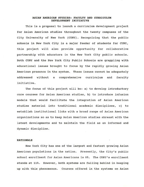 This is the successful proposal for a 3-year Asian American Studies Faculty and Curriculum Development Initiative which began in the Spring of 1994. The initiative received $15,000 in funding from the CUNY Office of Faculty Development. Its primary goal was to establish a plan for the development of Asian American studies curricula throughout the CUNY system. Its deliverables included seminars for teams of faculty across CUNY campuses and New York City public schools to develop curriculum and pedagogy as well as conferences, curriculum guides, and institutional plans, which resulted in the publication of the Asian American Studies Guidebook. The initiative was led by Dr. Julia To-Dutka (Baruch College), Dr. Peter Kwong (Hunter College), Dr. John (Jack) Tchen (Queens College), and Dr. Jacob Wong (NYC Board of Education). The Hunter College Asian American Studies Program (AASP) was established in 1993. As the only academic program in Asian American studies in the CUNY system, the AASP offers a minor in Asian American Studies and other resources and programming. The AASP supports scholars, artists, and activists advancing scholarship in the fields of Asian American studies and critical ethnic studies and serves as a resource for New York City's Asian American communities. In 2006, the program was at risk of being cut due to a lack of funding. Students formed the Coalition for the Revitalization of Asian American Studies at Hunter (CRAASH) and saved the program within a year. CRAASH is now a student-run club that continues to advocate for the AASP.