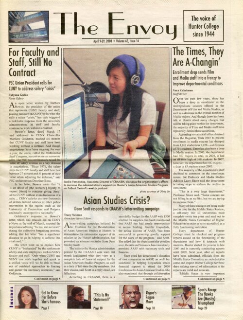 This article in the Hunter Envoy from April 2008 covers Dean Shirley Scott's response to claims made by the Coalition for the Revitalization of Asian American Studies at Hunter (CRAASH) about the lack of financial support from the Hunter administration for the Asian American Studies Program (AASP). Scott cited the program's success in order to disprove the claims and further used the AASP's status as an interdisciplinary program, rather than a free-standing department, to justify the administration's lack of investment. CRAASH insisted that the program's success was a result of efforts by AASP students, faculty, and acting director Jennifer Hayashida, and not the Hunter administration, and also refused Scott's use of the program's status as justification for its present condition. The Hunter College Asian American Studies Program (AASP) was established in 1993. As the only academic program in Asian American studies in the CUNY system, the AASP offers a minor in Asian American Studies and other resources and programming. The AASP supports scholars, artists, and activists advancing scholarship in the fields of Asian American studies and critical ethnic studies and serves as a resource for New York City's Asian American communities. In 2006, the program was at risk of being cut due to a lack of funding. Students formed the Coalition for the Revitalization of Asian American Studies at Hunter (CRAASH) and saved the program within a year. CRAASH is now a student-run club that continues to advocate for the AASP.