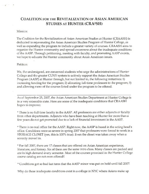 This petition was circulated by the Coalition for the Revitalization of Asian American Studies at Hunter (CRAASH) in the semester of its founding in Fall 2007. The petition outlines the issues facing the program and the reasons around CRAASH's forming: no full-time faculty, no office, lack of diverse course offerings, and the institutional freeze on the AAS minor. CRAASH's demands included: increased funding for the program, the allocation of full-time professors, and the expansion of course offerings. CRAASH petitioned for three months and collected over 1,000 signatures from Hunter students. The Hunter College Asian American Studies Program (AASP) was established in 1993. As the only academic program in Asian American studies in the CUNY system, the AASP offers a minor in Asian American Studies and other resources and programming. The AASP supports scholars, artists, and activists advancing scholarship in the fields of Asian American studies and critical ethnic studies and serves as a resource for New York City's Asian American communities. In 2006, the program was at risk of being cut due to a lack of funding. Students formed the Coalition for the Revitalization of Asian American Studies at Hunter (CRAASH) and saved the program within a year. CRAASH is now a student-run club that continues to advocate for the AASP.