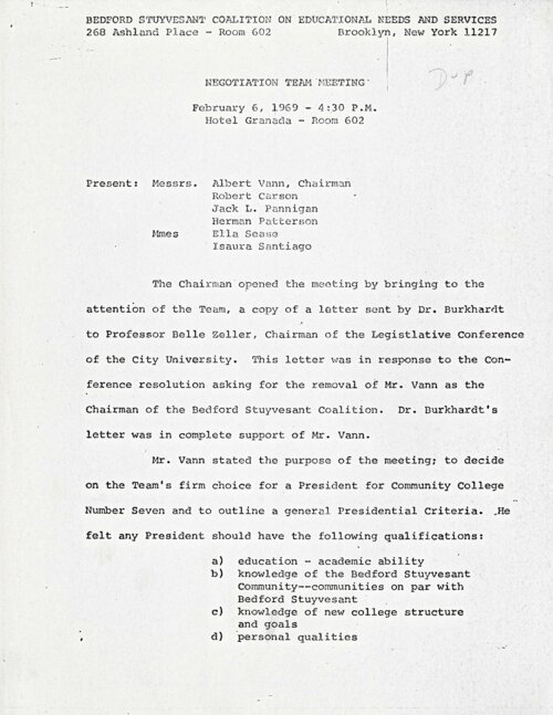February 6, 1969 Minutes of the Negotiation Team of the Bedford-Stuyvesant Coalition on Educational Needs and Services in preparation for the Presidential Search Committee meeting for Community College 7 The five-member Negotiation Team delegated by the Bedford-Stuyvesant Coalition on Educational Needs and Services (B-SCENS) met on February 6, 1969, to prepare for a meeting to be held later that day with five City University of New York officials, at which the Bedford-Stuyvesant representatives would present their recommended candidate for president of Community College 7. The Negotiation Team agreed to recommend Rhody McCoy for the position “because of his knowledge of the New York Public School system, his ability to assume leadership, his ability to meet and systematically deal with crisis, and his demonstrated concern for the needs and goals of a Black and Puerto Rican community,” among other qualifications. The team also prepared responses to anticipated arguments against McCoy’s appointment and outlined their own objections to the candidates CUNY officials had proposed. -