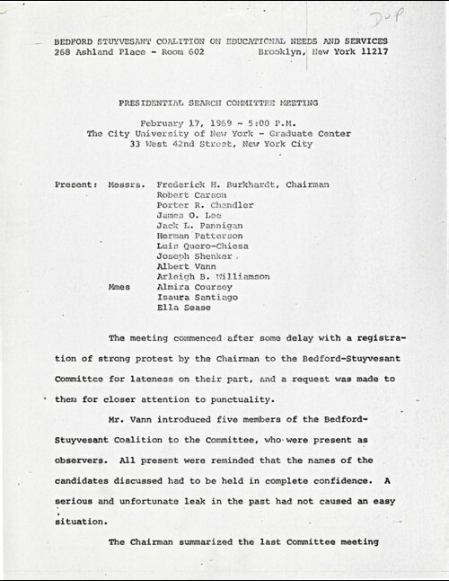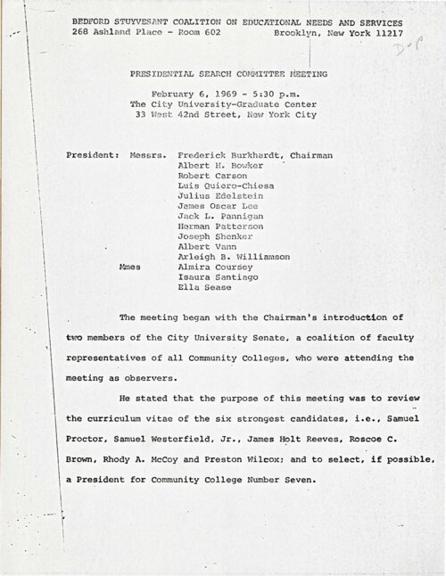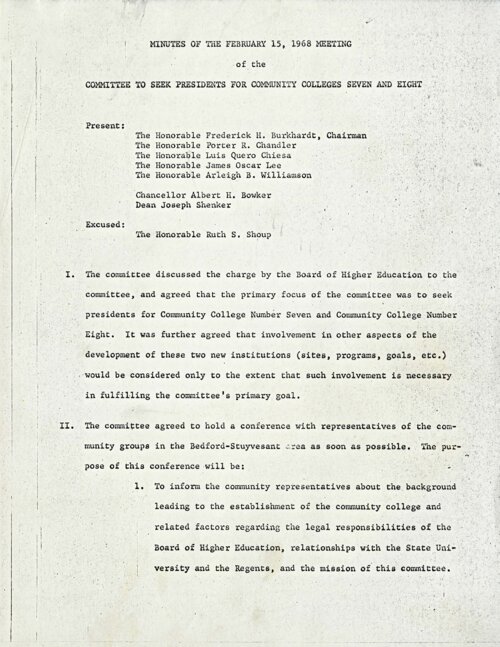 Committee to Seek Presidents for Community Colleges 7 and 8: Minutes - February 15, 1968, On February 15, 1968, seven City University of New York (CUNY) officials met to discuss their role and responsibilities as the Committee to Seek Presidents for Community Colleges Seven and Eight. The Committee agreed that their “primary focus… was to seek presidents” for the two new colleges, and that they would also consult with community organizations in Bedford-Stuyvesant, the announced location for Community College 7 and that two or three community delegates might “sit with the committee. . .with the same privileges afforded to faculty members who have been invited to participate by other Board [of Higher Education] presidential search committees.” In the coming weeks, Bedford-Stuyvesant community leaders successfully advocated for the committee's expansion to include five community representatives, balanced by an equal number of five CUNY officials. -