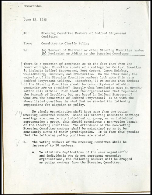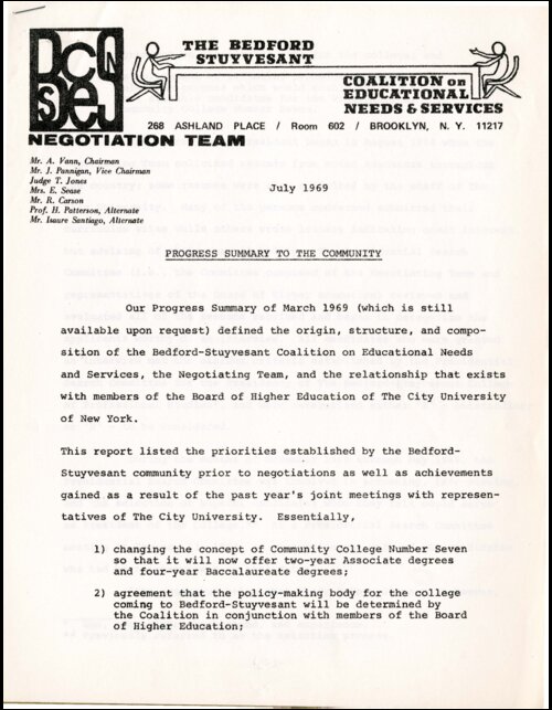 The history of the City University of New York (CUNY) has been fundamentally shaped and reshaped, in large part, by decisions of city and state officials, especially about where to site new colleges in the expanding municipal college system. One such controversy erupted in the early 1960s when CUNY officials and city politicians chose in 1963 to site a new community college (Kingsborough Community College) for Brooklyn in the largely white neighborhood of Sheepshead Bay, rather than in the largely Black and Puerto Rican neighborhoods of central Brooklyn. Five years later, in February 1968, when CUNY announced plans to establish a new “Community College 7 in or near Bedford-Stuyvesant… oriented to the Bedford-Stuyvesant Community and operated in consultation with the community,” the leaders of an extensive network of education advocacy groups and civil society organizations from that very community responded immediately and forcefully, with the memory of the struggle over Kingsborough Community College very much fresh in their minds. “Responsible Community Leaders,” wrote Ulysses Jordan, Chair of the Education Committee of the Bedford Stuyvesant Youth in Action Network “… were not consulted by the Educational Structure on both the state and local levels, in respect to programming and the planning stages for the development of this college," as this document in the Community College 7 collection indicates.