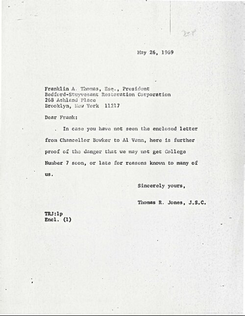May 26, 1969 Letter from Thomas Jones to Franklin Thomas On May 26, 1969, New York State Justice Thomas Jones wrote to Franklin Thomas, president of the Bedford-Stuyvesant Restoration Corporation, forwarding a copy of a letter sent four days earlier from Albert Bowker to Al Vann, Chair of the Bedford-Stuyvesant Coalition on Educational Needs and Services. In that letter, which Jones attached, Bowker had expressed a wish to overcome an “impasse” between City University of New York (CUNY) officials and an appointed planning delegation from the Bedford-Stuyvesant community, led by Vann, over preferred candidates for the presidency of the new Community College 7. In his brief cover letter, Jones expressed his alarm over “the danger that we may not get Community College 7 soon, for reasons known to many of us.” In the coming weeks, Jones, with a contingent of other community members, would publicly split from Vann and his allies in a schism that in the end determined the fate of the new college. -