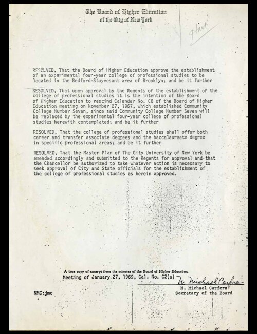 January 27, 1969 Resolution of the Board of Higher Education approving the establishment of a four-year experimental college in Bedford-Stuyvesant, Brooklyn On January 27, 1969, the Board of Higher Education of New York City resolved to establish an “experimental four-year college of professional studies located in or near Bedford-Stuyvesant, Brooklyn,” effectively supplanting plans announced a year earlier to establish Community College 7 as a two-year institution. The resolution marked a victory for Bedford-Stuyvesant’s educators and community leaders who had vigorously advocated and negotiated for the new college to be a senior, four-year degree granting institution with relevant professional pathways for the community’s youth. -