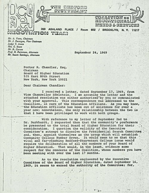 September 24, 1969 Letter from Al Vann to Porter Chandler On September 24, 1969, Al Vann, Chairman of the Bedford-Stuyvesant Coalition on Educational Needs and Services (B-SCENS) wrote a letter to Porter Chandler, Chairman of the Board of Higher Education, responding to a recent Resolution of the Executive Committee of the Board of Higher Education to disband the Presidential Search and Planning Committee for Community College 7, of which Vann had been a community-appointed member. In his letter, Vann denies the authority of the Board of Higher Education and its Executive Committee to disband the committee and, as they had also announced, to proceed in planning a college in and for Bedford-Stuyvesant without the “involvement, support and endorsement” of the B-SCENS and its members. -