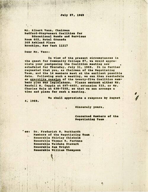 Unsigned July 27, 1969 Letter from "Concerned Members of the Negotiation Team" to Al Vann On July 27, 1969, “Concerned members of the Negotiation Team” of the Bedford-Stuyvesant Coalition on Educational Needs and Services (B-SCENS) drafted a letter to Al Vann, Chairman of the B-SCENS and the Negotiation Team, asking that he postpone an upcoming coalition meeting, instead meeting with the “fourteen members.” Those “fourteen” were likely a group of B=SCENS members who had written directly to City University of New York (CUNY) Chancellor Albert Bowker a month earlier, formally dissenting from the stance Vann had taken in deliberations over the selection of president for CUNY's proposed Community College 7. -