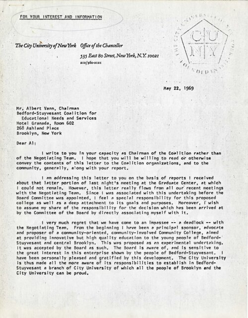 Chancellor Albert Bowker to Al Vann: Letter - May 22, 1969 On May 22, 1969, Albert Bowker, Chancellor of the City University of New York wrote a letter to Al Vann, Chairman of the Bedford-Stuyvesant Coalition on Educational Needs and Services (B-SCENS), conveying his wish to overcome a “deadlock” over the choice of president for Community College 7. In the letter, Bowker clarifies his reasons for not supporting Rhody McCoy for the presidency, and his position on the power of the representative delegation of Bedford-Stuyvesant community organizations, led by Vann, to select a president for the new CUNY college. Bowker concluded by expressing concerns that Community College 7 may not be established if Vann and his contingent are unwilling to compromise. -