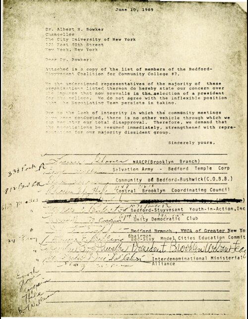 June 10, 1969 Letter from the Bedford-Stuyvesant "majority dissident" group to CUNY Chancellor Albert Bowker On June 10, 1969, ten representatives of various Bedford-Stuyvesant’s educational and community organizations wrote to Albert Bowker, Chancellor of the City University of New York (CUNY) formally expressing their disagreements with the Bedford-Stuyvesant Coalition on Educational Needs and Services (B-SCENS) Negotiation Team for Community College 7. In recent weeks, the five-member Negotiation Team, which had been appointed by B-SCENS, and chaired by Al Vann, had reached what Bowker had deemed an “impasse” with CUNY officials over the selection of a president for the new college. The letter’s signatories, who included Louise Glover of the National Association for the Advancement of Colored People (NAACP) and representatives of several local chapters of the Young Men’s Christian Association (YMCA), demanded to be represented in the ongoing deliberations with CUNY. The “majority dissenters” also cast aspersions on the processes by which Vann and his Negotiation Team had represented the preferences of the broader Bedford-Stuyvesant community. -
