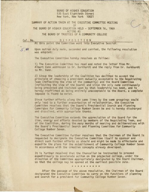 September 16, 1969 Resolution of the Board of Higher Education to Disband the Presidential Search and Planning Committee for Community College 7 On September 16, 1969 the Executive Committee of the Board of Higher Education (BHE( issued a formal resolution to dissolve the “Presidential Search and Planning Committee for Community College 7” due to the insistence of the Bedford-Stuyvesant community delegation to the committee that Rhody McCoy be appointed president of the new college. The BHE Executive Committee deemed McCoy “entirely unacceptable” for the job. The Executive Committee further resolved that Chancellor Albert Bowker should “proceed expeditiously to accelerate action on the projected college,” working with a new committee appointed entirely by the BHE. -