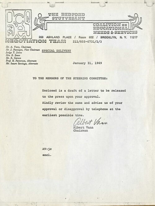 January 31, 1969 Draft Letter to the Editor of the New York Times from Al Vann On January 31, 1969, Al Vann, circulated to his fellow Steering Committee Members of the Bedford-Stuyvesant Coalition on Educational Needs and Services (B-SCENS) a draft letter to the Editor of the New York Times, responding to an article published the day before. In the article, the Times had reported that the Ford Foundation, as a condition for disbursement of a $442,000 grant for the establishment of Community College 7, had asked the City University of New York (CUNY) to review its relationship with Vann, in response to concerns voiced by some faculty members’ over allegedly anti-Semitic statements he had made. In his draft letter, Vann decried his accusers’ choice to attack a community “determined to work through the democratic process to eradicate the educational ills” of their youth, and called broadly for an end “to attempts to carry us away from our focus” in the community's efforts to establish the new college. -