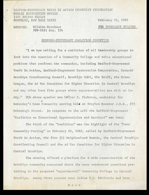February 13, 1968 Youth in Action Press Release Announcing Formation of the Bedford-Stuyvesant Coalition on Educational Opportunities and Services In this February 13, 1968 press release, Youth in Action (YiA), a Bedford-Stuyvesant-based anti-poverty organization, announced the formation of the “Coalition on Educational Opportunities and Services,” (later changed to “Bedford-Stuyvesant Coalition on Educational Needs and Services” or B-SCENS). The new organization, which had been created in response to the mass meeting held several days earlier, was composed of prominent Bedford-Stuyvesant community-based education and anti-poverty organizations. According to press release, the Coalition would continue to meet to seek satisfactory answers from City University of New York (CUNY) officials to questions raised in that earlier meeting about CUNY’s proposed new “Community College 7” in order to allow the community to formulate and propose its own plans for the new college.