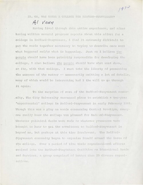 Draft Letter from Al Vann to the Editor of the Amsterdam News On February 14, 1970, Al Vann, Chairman of the then-disbanded Bedford-Stuyvesant Coalition on Educational Needs and Services, wrote a letter to the editor of the Amsterdam News, offering his account of the negotiations that had taken place over the past two years between Bedford-Stuyvesant community leaders and City University of New York (CUNY) officials in planning Medgar Evers College, originally referred to as “Community College 7.” In his letter, Vann responded to public criticism, defending the firm stance he and the Coalition had taken in advocating for a college controlled by the community, and willing to “do what is necessary to protect [Black youth], and to build a firm foundation – necessary for the rebirth of the dignity and strength of the Black man.” -