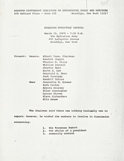 March 13, 1969 Minutes of the Steering Committee of the Bedford-Stuyvesant Coalition on Educational Needs and Services: On March 13, 1969, the Steering Committee of the Bedford-Stuyvesant Coalition on Educational Needs and Service met to discuss progress in the planning for Community College 7. At the meeting, the Committee formulated and agreed on three “definitive items” that their five member Negotiation Team would present to City University of New York (CUNY) officials at an upcoming high-level planning meeting about Community College 7, one of which was that the college be named for the late Martin Luther King, Jr. The Steering Committee also agreed they would present CUNY officials with a unanimous recommendation for a candidate for president of the new college, but deferred their deliberations over that decision to a later meeting. -
