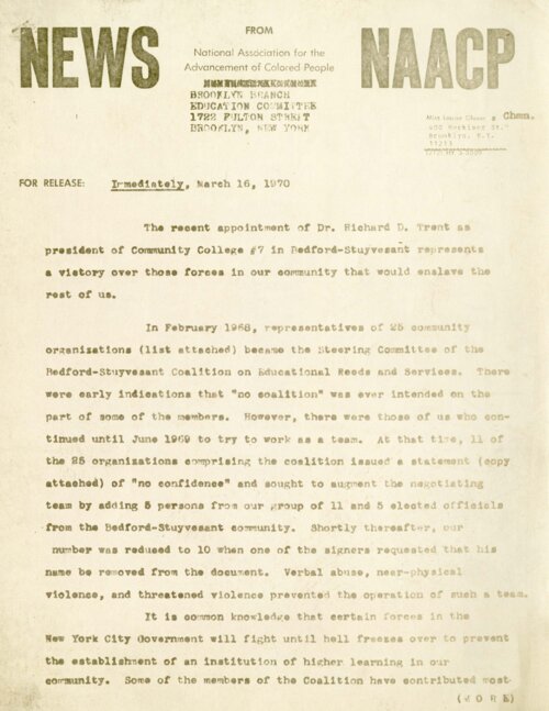 Brooklyn Branch Education Committee of the NAACP Press Release, March 16, 1970: The Appointment of Richard Trent as President of Medgar Evers College, CUNY On March 16, 1970 the National Association for the Advancement of Colored People (NAACP) issued a press release announcing their approval of the appointment of Richard Trent as the president of the newly established Medgar Evers College, CUNY in Crown Heights, Brooklyn. In the press release, the authors criticized the stances and tactics taken by the Bedford-Stuyvesant community leaders originally delegated two years earlier to engage in negotiations with City University of New York (CUNY) officials, holding the community leaders responsible for delaying and jeopardizing the establishment of the new college in and for Central Brooklyn. The press release concluded with the NAACP’s call to the Bedford-Stuyvesant community’s “silent majority” to support the new college in the face of continued controversy over its founding and leadership that they anticipated. -